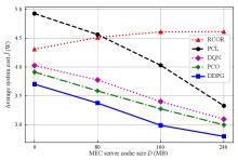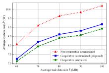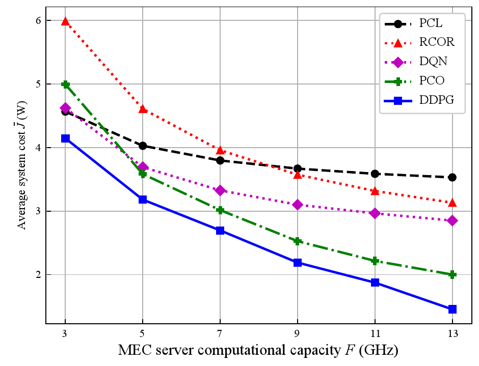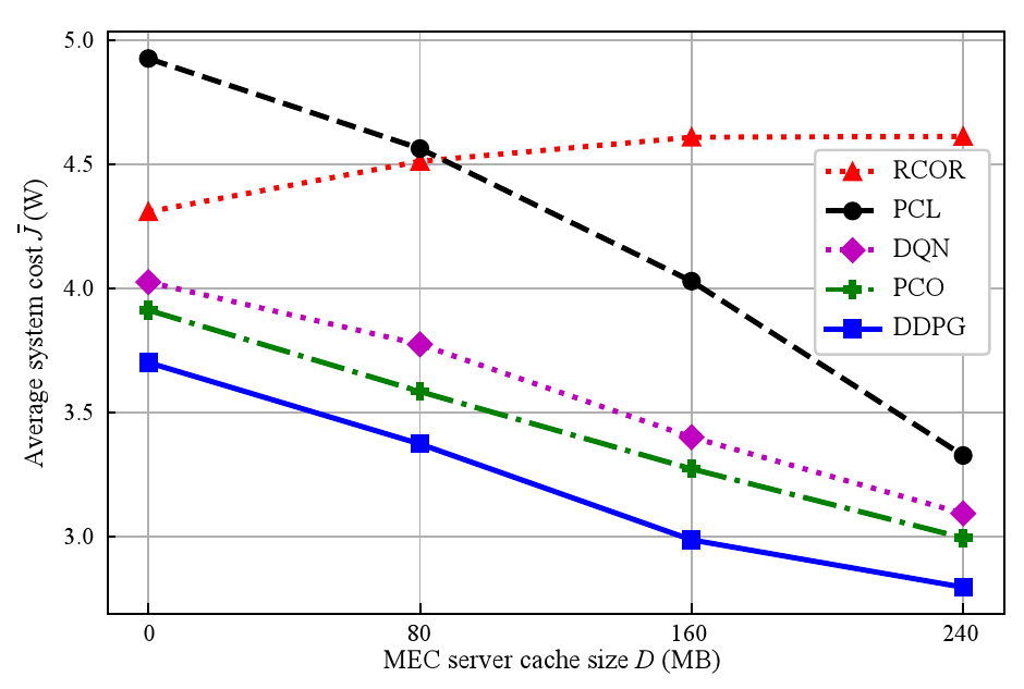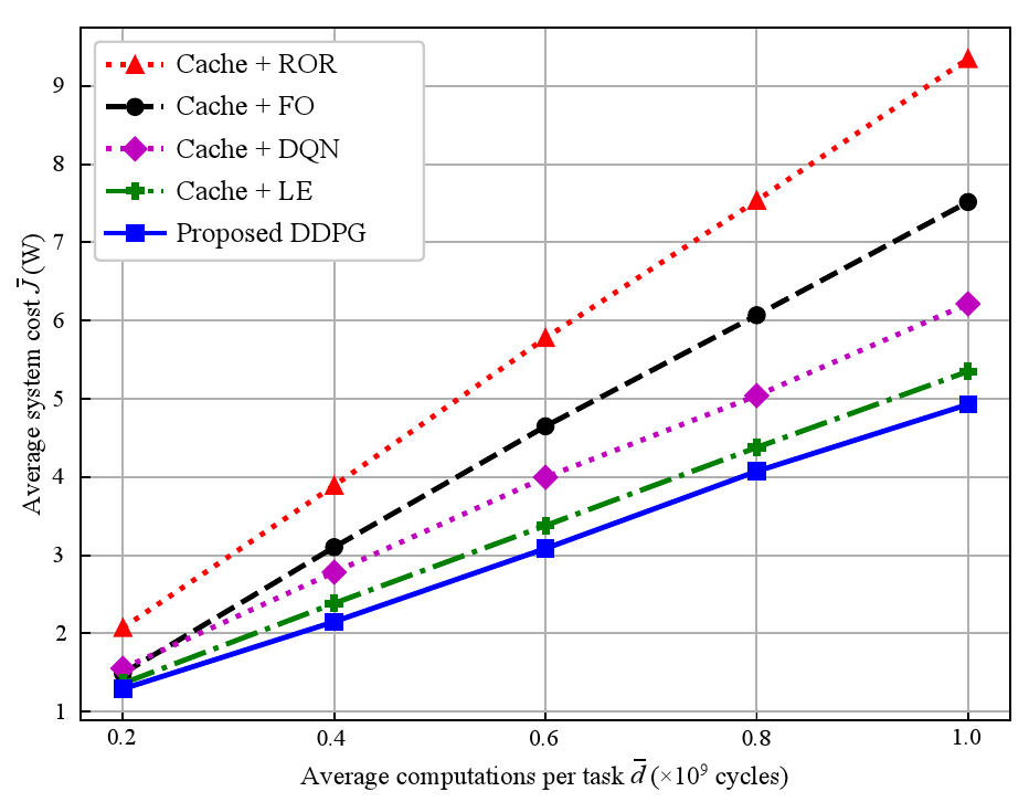 Abstract Mobile Edge Computing (MEC) is one of the most promising techniques for next-generation wireless communication systems. In this paper, we study the problem of dynamic caching, computation offloading, and resource allocation in cache-assisted multi-user MEC systems with stochastic task arrivals. There are multiple computationally intensive tasks in the system, and each Mobile User (MU) needs to execute a task either locally or remotely in one or more MEC servers by offloading the task data. Popular tasks can be cached in MEC servers to avoid duplicates in offloading. The cached contents can be either obtained through user offloading, fetched from a remote cloud, or fetched from another MEC server. The objective is to minimize the long-term average of a cost function, which is defined as a weighted sum of energy consumption, delay, and cache contents’ fetching costs. The weighting coefficients associated with the different metrics in the objective function can be adjusted to balance the tradeoff among them. The optimum design is performed with respect to four decision parameters: whether to cache a given task, whether to offload a given uncached task, how much transmission power should be used during offloading, and how much MEC resources to be allocated for executing a task. We propose to solve the problems by developing a dynamic scheduling policy based on Deep Reinforcement Learning (DRL) with the Deep Deterministic Policy Gradient (DDPG) method. A new decentralized DDPG algorithm is developed to obtain the optimum designs for multi-cell MEC systems by leveraging on the cooperations among neighboring MEC servers. Simulation results demonstrate that the proposed algorithm outperforms other existing strategies, such as Deep Q-Network (DQN).